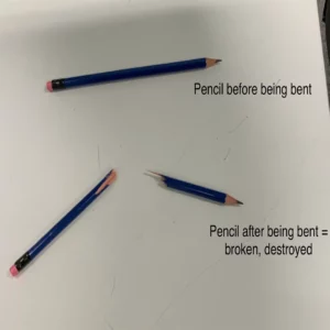 Try this for yourself. Take a pencil and gently try to bend it. What happens, has the pencil changed? No, it hasn’t. Try to bend the pencil again, but this time try harder, try with more force. What happens? Did your pencil break? Next, taking an elastic band , stretch it gently.